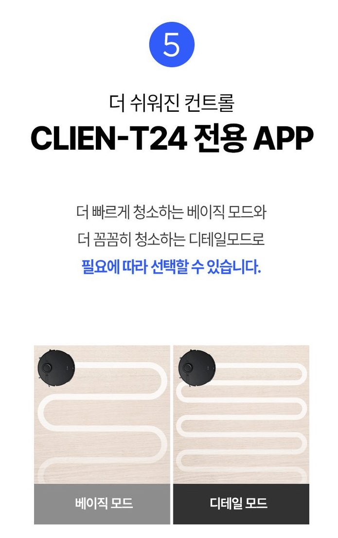 반면 클리엔 T24는 물걸레 패드가 1분에 480번 진동하여 손걸레질보다 강력하게 청소하며, 듀얼 터보 스테이션으로 먼지와 이물질을 깔끔하게 흡입합니다.